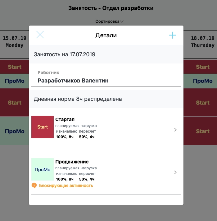 При создании активности есть еще 3 ньанса, которые вносят коррективы в планах: Соотношение занятости, использование переработок, блокирующая задача. Они влияют на алгоритм расчета окончания работы, если существуют наложение активностей разных работ у одного человека. На рисунке ниже будет показано как эти нюансы можно разглядеть прямо в табличке. Наиболее полный пример у Разработчикова Валентина на 19 июля: