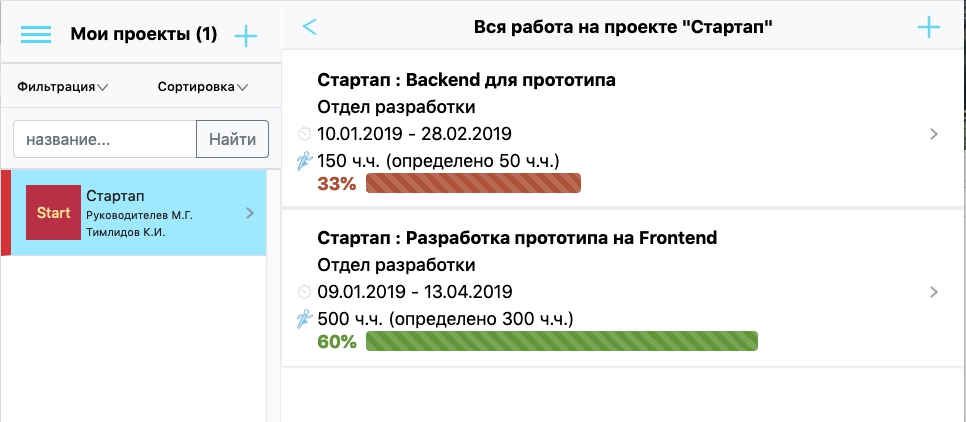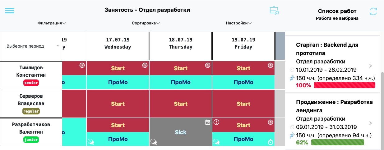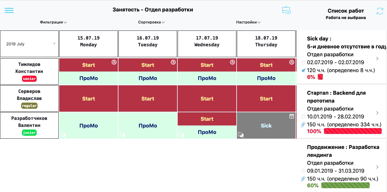 Одна работа может относится только к одному отделу. Если вам например надо сделать прототип и для этого надо делать Backend и Frontend, то вам надо создать две работы. У каждой работы есть индикация загруженности. Когда работа только создана, она равна 0%, кроме того на экране списка работ отображаются определенные часы. Это те часы на которые назначены исполнители линейным руководителем. Если людей на проекте совсем нет или переизбыток то индикатор имеет цвет близкий к красному. Если определенность совпадает с ожидаемой оценкой от проектного менеджера то цвет ближе к зеленому настолько, насколько точнее совпадение.