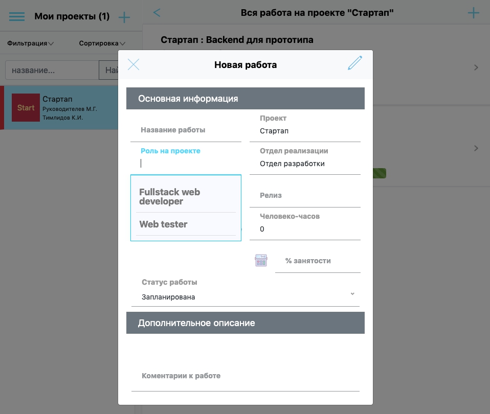 Теперь разберем подробнее создание работы. Необходимо придумать название работы, например "спринт № 13", если вы знаете роль специалиста, то можете ее начать вводить и из подгруженного списка надо выбрать необходимую. Отдел заполнится автоматически. Если вы не имеете представление о направлении специалистов, но знаете в каком отделе они обитают, выбирайте сначала отдел, затем список ролей будет ограничен только этим отделом. Версия и релиз являются необязательными полями, они как пометки служат для понимания, в какой версии эта работа задействована.