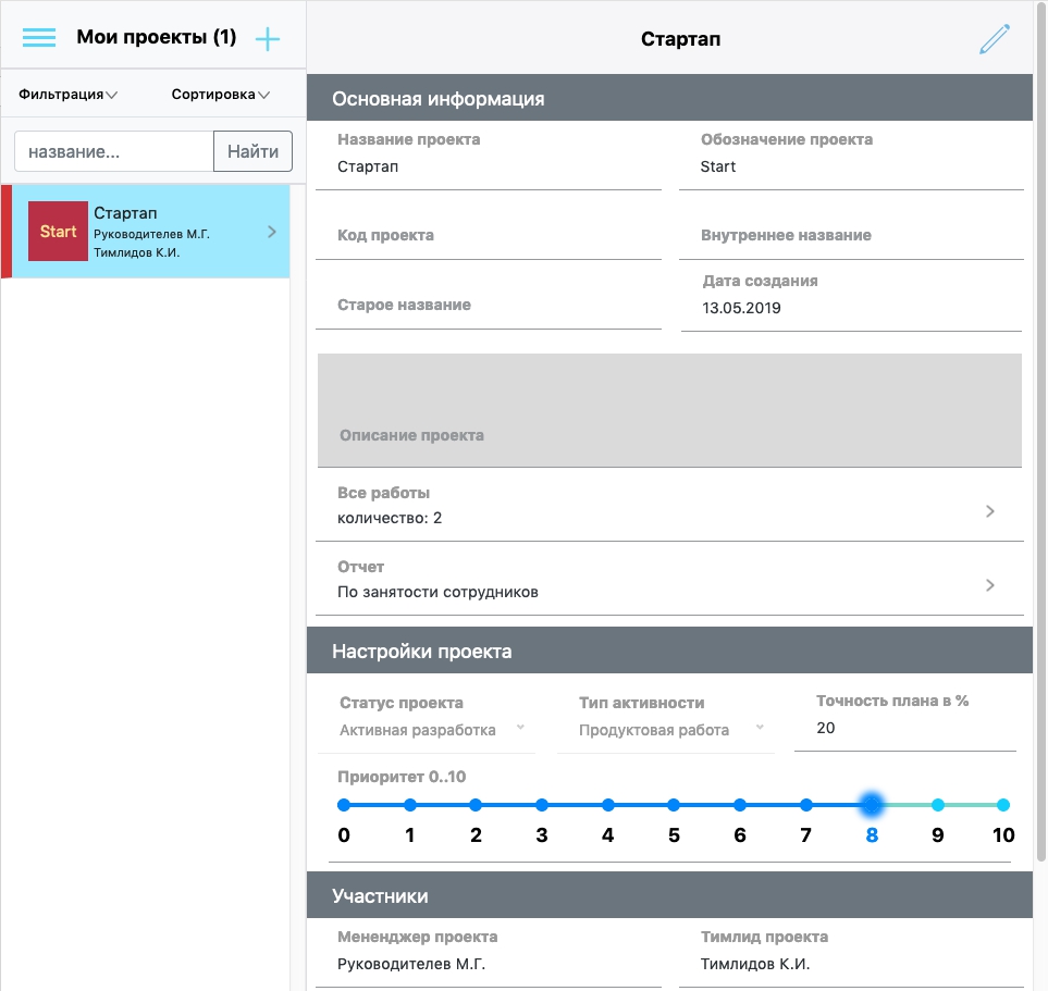Тип активности определяет категорию, в которой можно будет найти проект. Статус проект нужен для фильтрации. В ряде случаев не получится выбрать проект, который имеет статус "В архиве (закрыт)". Остальные поля нужны для собственных пометок, например, чтобы не забыть своего тимлида или вести историю переименований проектов.