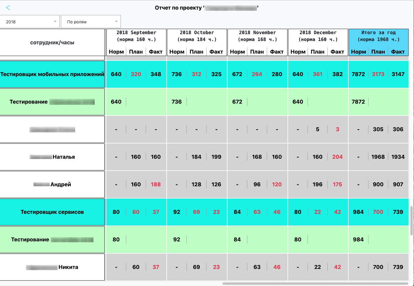 Группировки выделяются зелеными цветами и у них цифры несколько иные: за норму считается то, сколько ожидает увидеть проектный менеджер в загрузке, за план считаются часы, определенные линейным руководителем ну а факт - неизменно часы, списанными исполнителями.